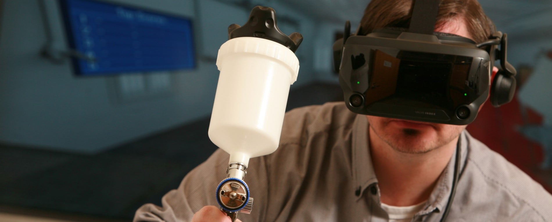 The VR headset immerses the trainee in a virtual paint booth, complete with everything from aircraft parts to the production floor itself. The system can be programmed with various paint specifications, such as the thickness of the coating required. So as the operator uses the spray gun, they can see whether too much or too little paint is being used and look for inconsistencies in the way the coating is being applied.
