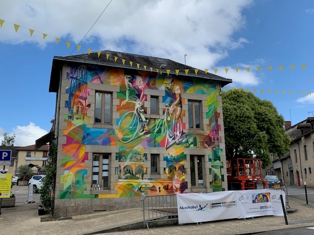 AkzoNobel, entreprise internationale référente sur le marché des peintures et des revêtements, a inauguré dimanche 9 juillet 2023 aux côtés de la mairie de Saint-Léonard-de-Noblat (87), une fresque picturale sur la façade de l’Office de Tourisme. Cette œuvre est signée par l’artiste-peintre locale, Sêma Lao. Elle rend hommage à l’histoire de cette ville ainsi qu’à celle de cette course mythique et colorée qui passionne le monde depuis plus de cent ans et dont AkzoNobel est Fournisseur Officiel pour la troisième année consécutive.