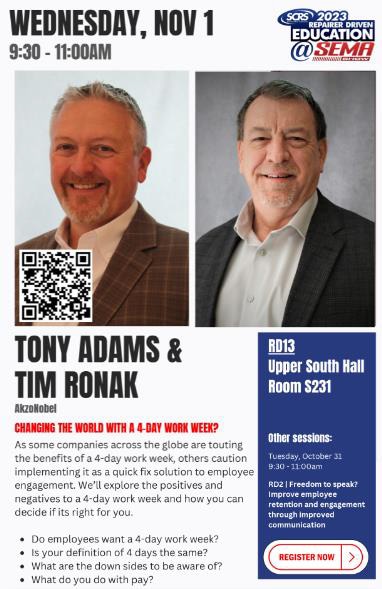 On the educational front, AkzoNobel employees and customers will share industry insights and thought leadership regarding some of the most important topics affecting the collision repair industry today. On Tuesday, October 31, Tony Adams kicks off SEMA day one by sharing insights on improving employee retention and engagement through communications in his talk, “Freedom to speak?” Also Tuesday, our customer Andrew Batenhorst presents his insights on the “Death of the ‘estimator’ role.” Wednesday, November 1, Tony Adams and Tim Ronak are joined by customers Stephen Bozer and Kena Dacus for what is sure to be a lively and engaging discussion, “Changing the world with a four-day workweek?”